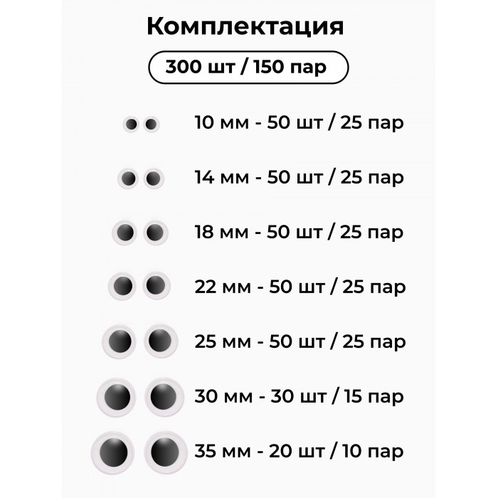 Глазки клеевые для игрушек самоклеящиеся (300 штук, 10/14/18/22/25мм по 50шт, 30мм-30шт, 35-20шт) 266217